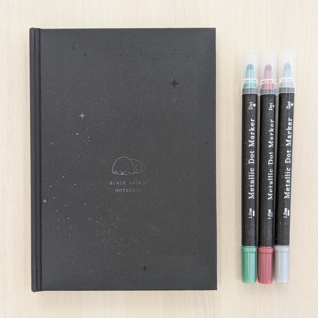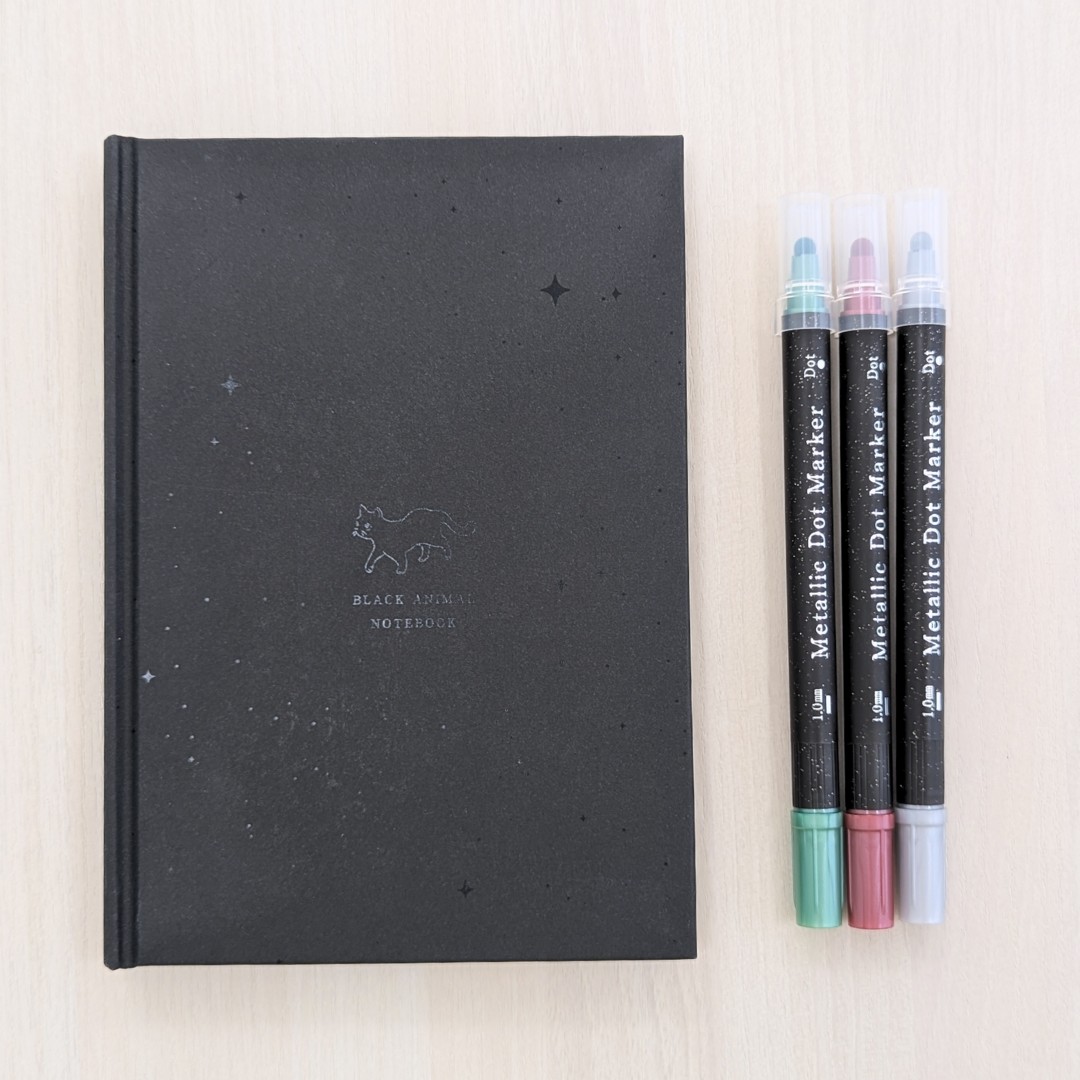 黒い紙に映えるメタリックマーカー付きで、すぐに書き始められるセットです。