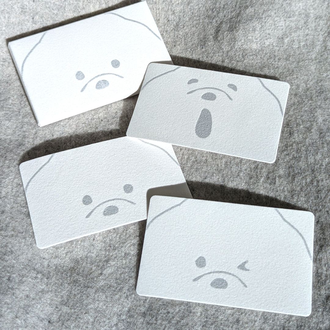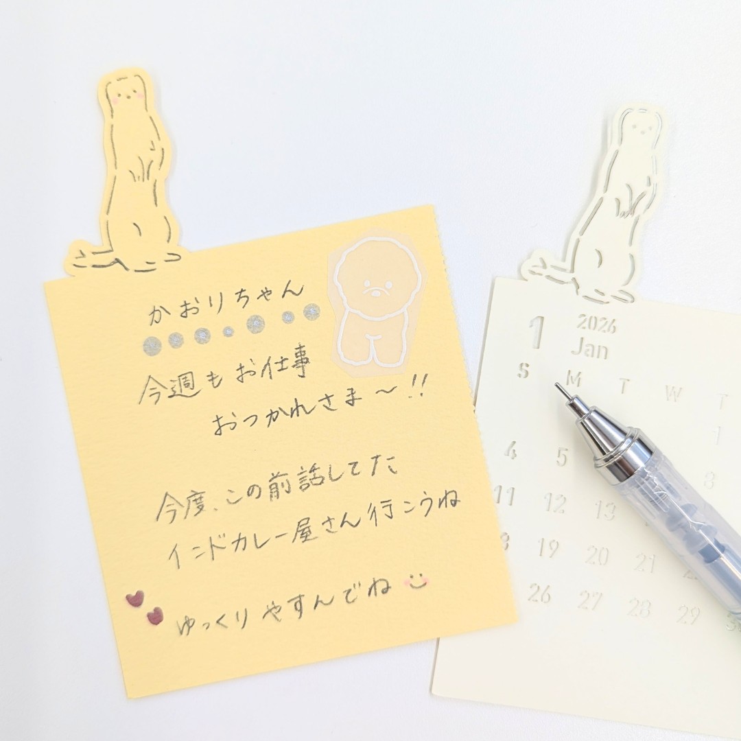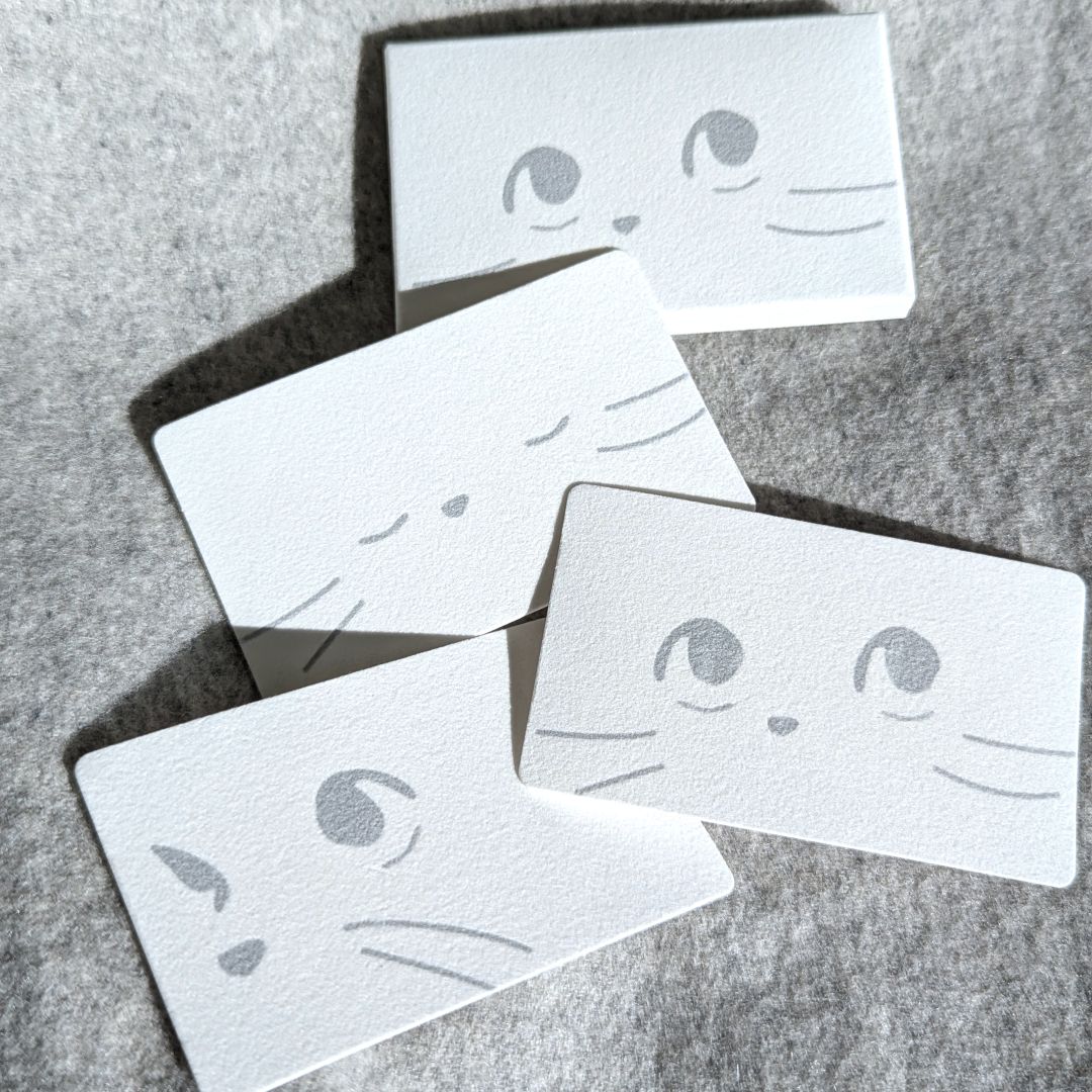 植毛紙という紙を使った、ふわふわ手触りのお顔がキュートな名刺サイズのケース付きメッセージカード。ふわふわ面にもボールペンやマーカーで書き込みができるので、アレンジをお楽しみいただけます。裏面の上質紙にはしっかりメッセージを書いて、犬猫好きなあの方への贈り物に。